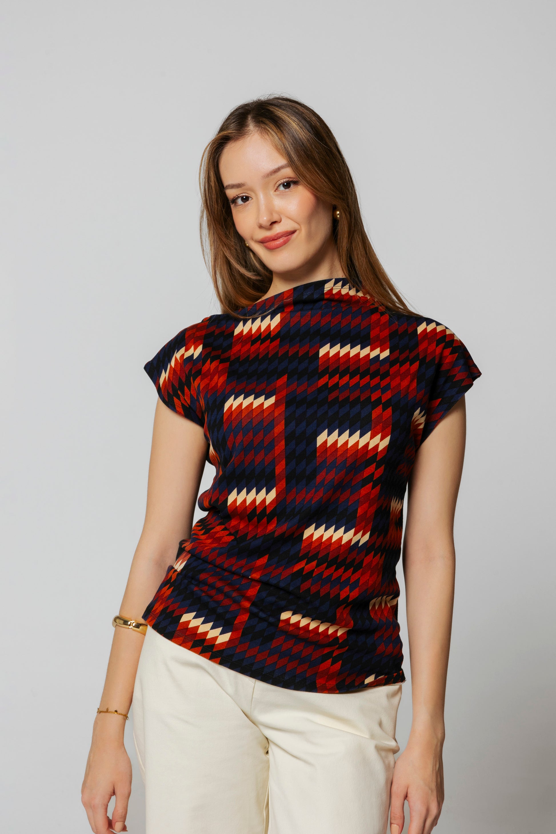 The sleeveless, asymmetrical blouse with a subtle mock neck combines elegance and comfort by gently hugging the body thanks to its slim-fit cut and stretchy fabric.